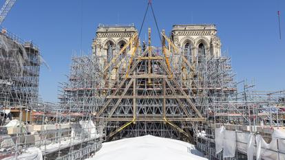Les huit fermes qui forment le cœur de l’ossature de la charpente devraient être toutes en place d’ici à septembre ou octobre. Déjà, le «tabouret» devant soutenir la flèche est installé. Sous réserve d’intempéries - y compris d’une canicule empêchant tout travail -, la flèche devrait s’élancer dans le ciel d’ici à la fin de l’année 2023. La reconstitution de la grande charpente médiévale, surnommée autrefois la «forêt», doit se faire en parallèle - tout se tenant pour soutenir l’édifice. «Pas à pas, nous avançons vers la réouverture, calmes et sereins», a indiqué le général Georgelin, devant la presse.