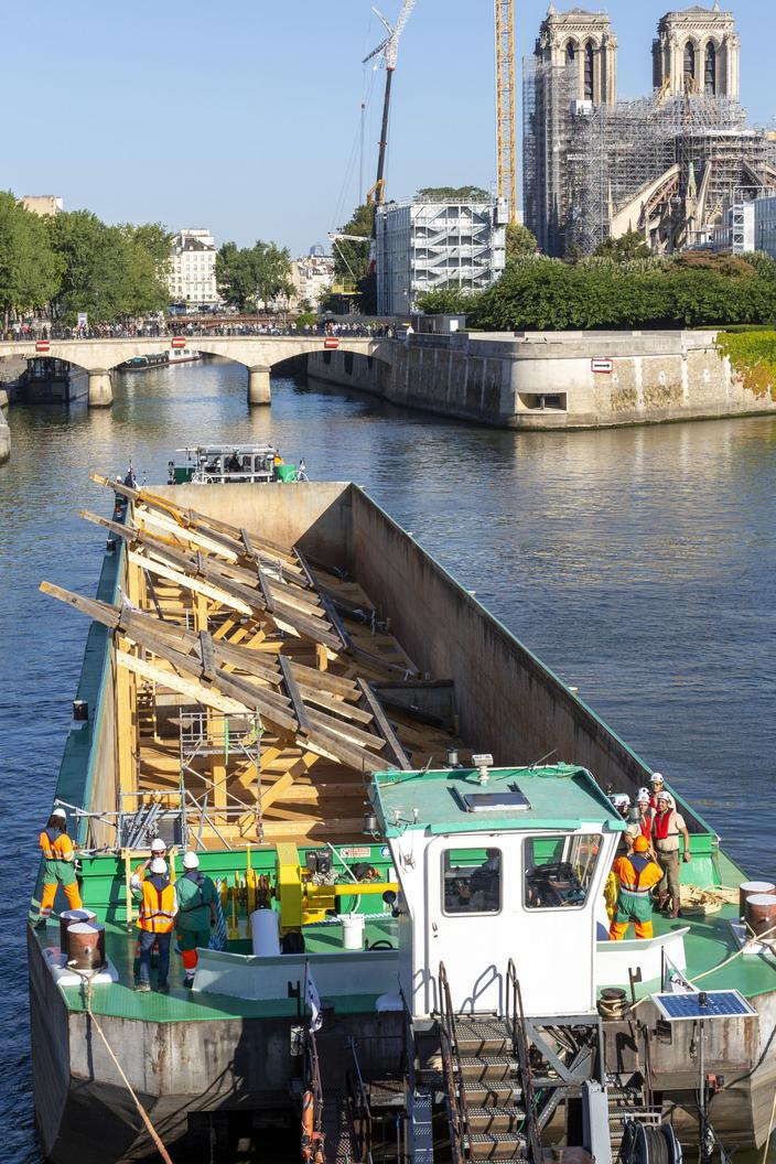 Mardi, les immenses pièces de chênes (dont les grumes ont été prélevées dans les forêts françaises, puis sciées) avaient été acheminées dans une longue barge, depuis le port d’Ivry-sur-Seine (Val-de-Marne). Le fleuve a été d’ailleurs fermé pendant quelques heures à la circulation fluviale aux abords de la cathédrale.
