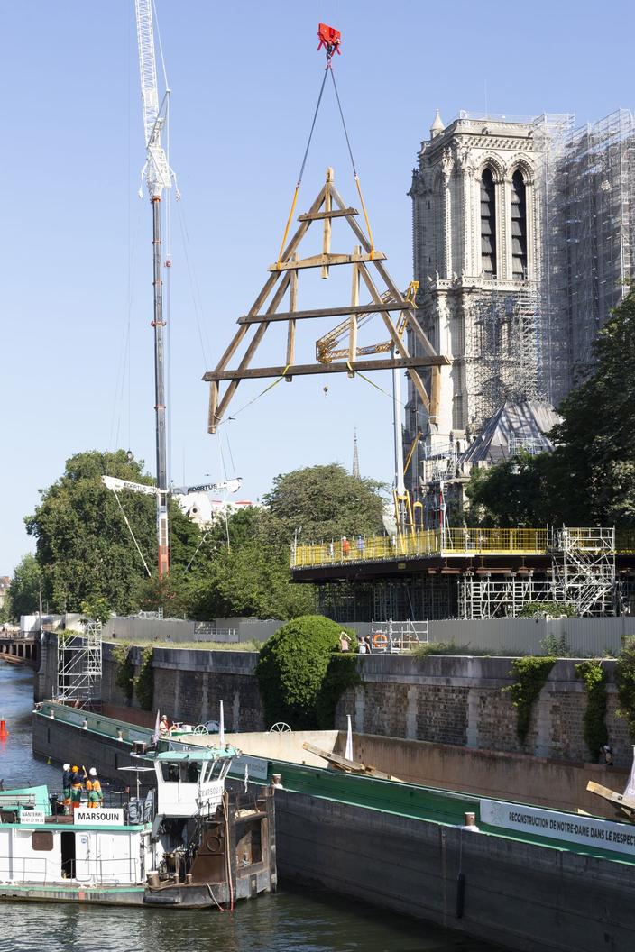 La «forêt» de Notre-Dame de Paris prend petit à petit racine sur les hauteurs de la cathédrale. Mardi matin, trois des huit fermes destinées à former l’ossature des charpentes qui entourent la flèche de Notre-Dame ainsi que celle des deux bras du transept ont été déposées, au sommet de l’édifice. Par ce temps ensoleillé, le grutage de la structure triangulaire, taillée en chêne massif, a évidemment suscité un attroupement important sur le pourtour du monument, du parvis à l’ensemble des quais voisins, jusqu’au pont de l’Archevêché. Le tout sous une nuée de caméras et en présence du général Georgelin, président de l’Établissement public de Notre-Dame et du ministre des Transports, Clément Beaune.