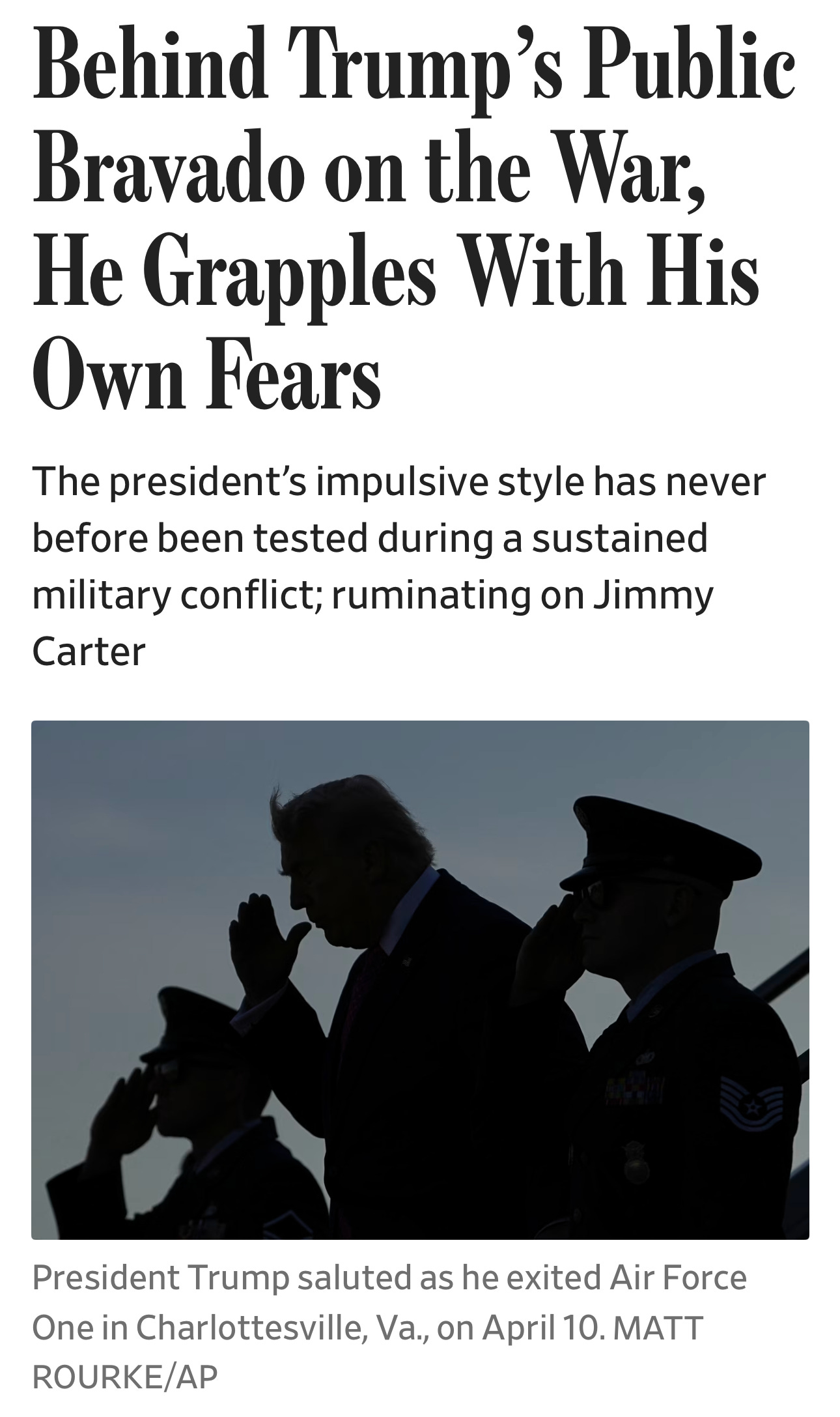 L’enquête du WSJ révèle un contraste (un fossé ?) entre l’image publique de fermeté de Trump et ses inquiétudes en privé à propos de la guerre contre l’Iran.