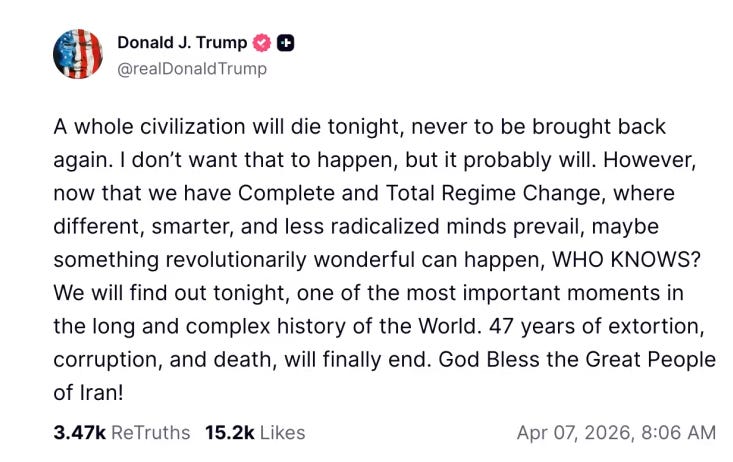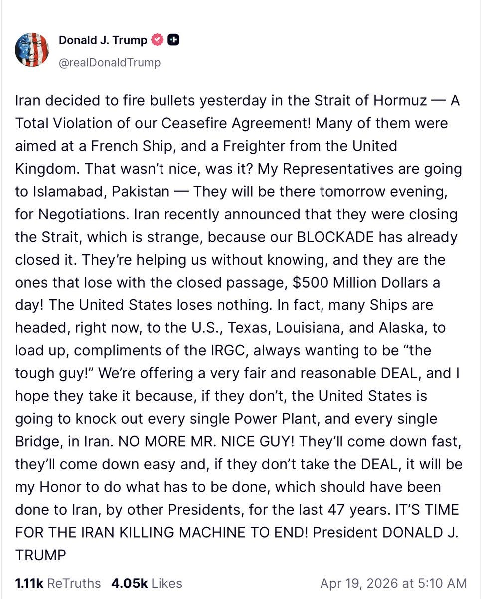 “Nous proposons un ACCORD très juste et raisonnable, et j’espère qu’ils l’accepteront parce que, sinon, les États-Unis vont détruire chacune des centrales électriques et chacun des ponts en Iran. FINI MR. NICE GUY ! ! Ils céderont vite, ils céderont facilement et, s’ils n’acceptent pas l’ACCORD, ce sera un honneur pour moi de faire ce qui doit être fait, ce qui aurait dû être fait à l’Iran par d’autres présidents depuis 47 ans. IL EST TEMPS DE METTRE FIN À LA MACHINE À TUER IRANIENNE ! Président DONALD J. TRUMP”