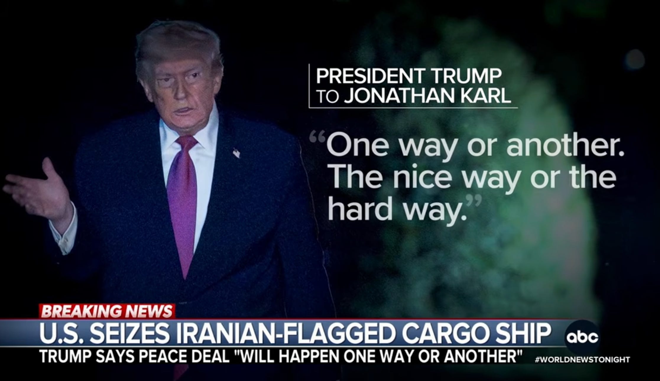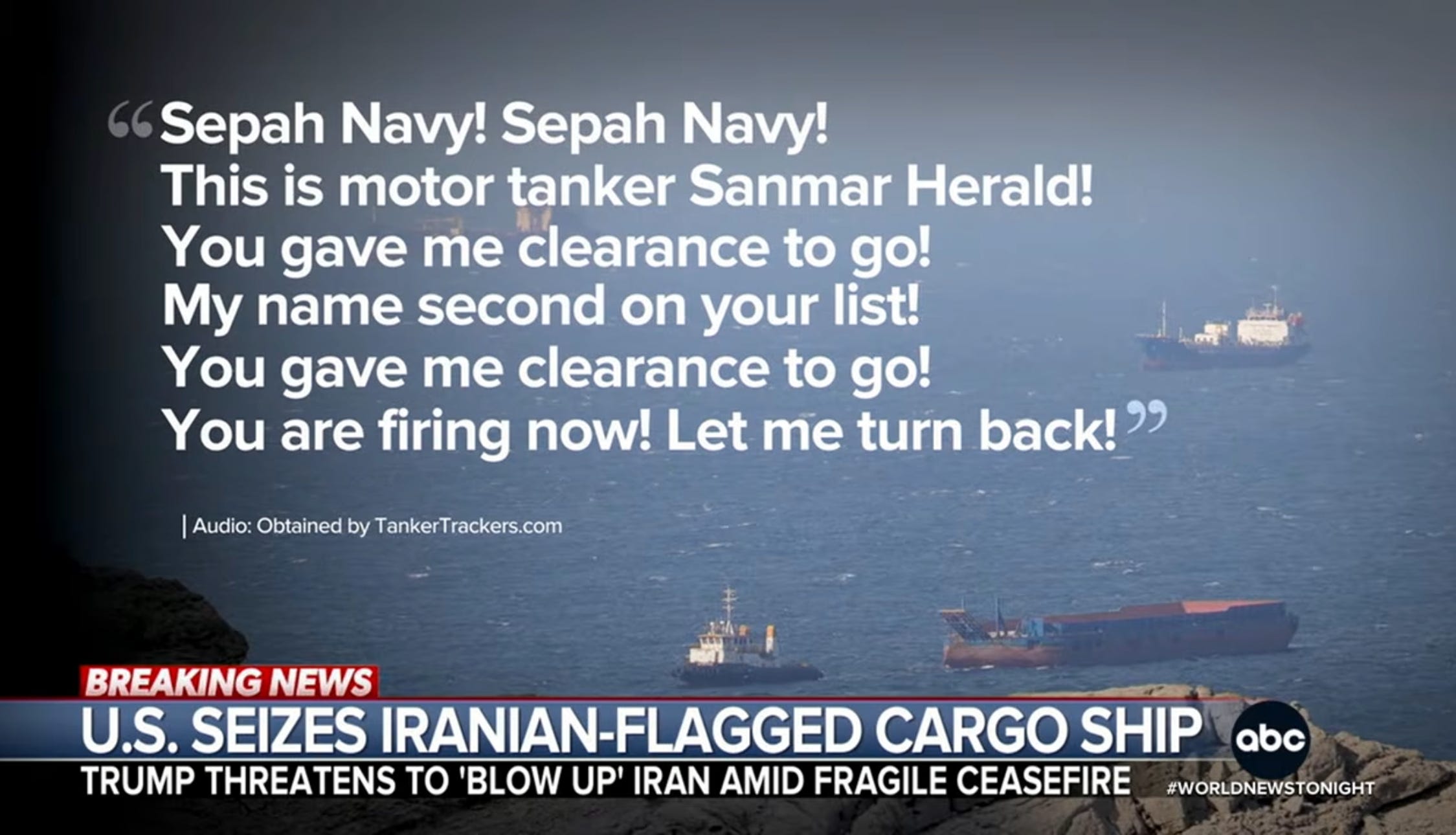 Un destroyer a tiré sur un cargo battant pavillon iranien qui tentait de contourner le blocus naval imposé par Washington. Après plusieurs heures d’avertissements, le navire a été immobilisé, puis pris par des Marines américains. C’est la première fois depuis le début du blocus qu’une opération de ce type est menée par la force.